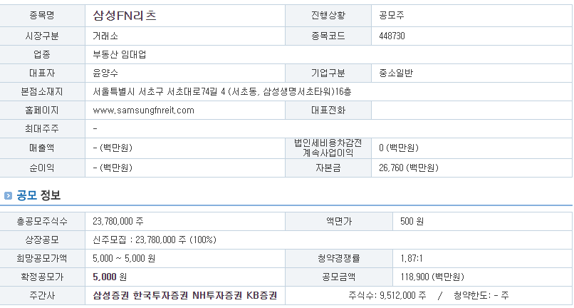 일반투자자를 대상으로 한 일반청약은 27일 ~ 28일까지 이틀간 진행되었습니다. 삼성FN리츠는 오는 30일 납입을 거쳐 3월 10일 유가증권시장에 상장됩니다.