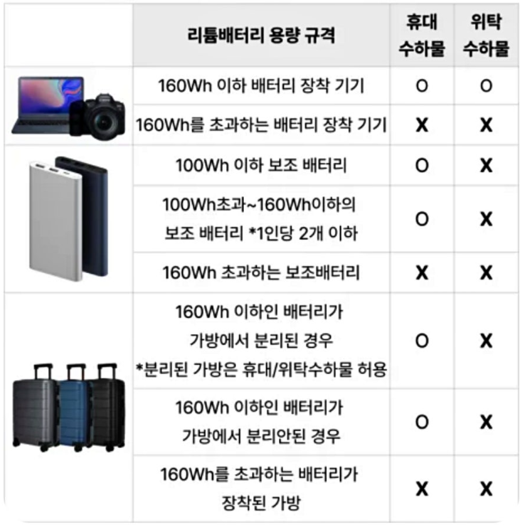 - 100~160Wh는 항공사 승인 필요, 대부분 2개까지 허용