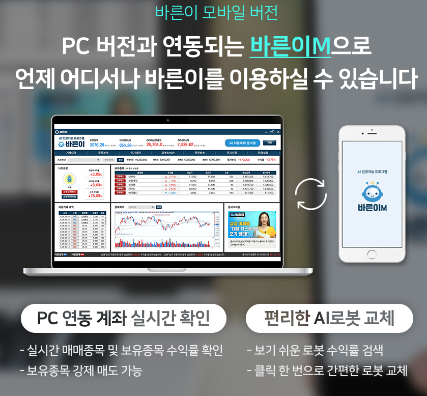 바른이 모바일 버젼도 개발되어 언제 어디서나 바른이 PC 버전과 연동되어 로봇이 보유한 종목의 강제 매도 및 로봇의 자유로운 교체가 가능해요.