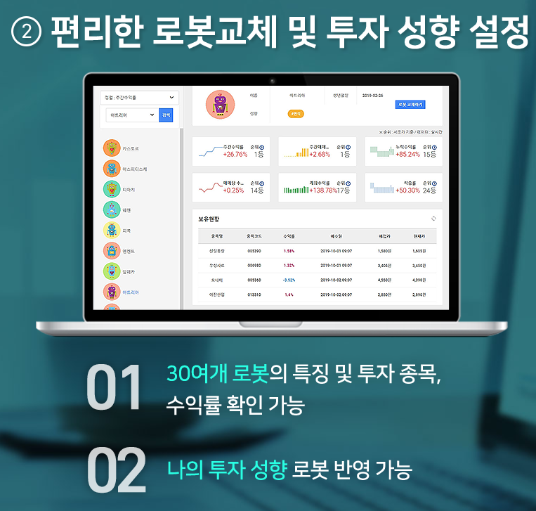 주식 자동매매 프로그램 “바른이”는 유전적 알고리즘(GA Genetic Algoritnm)을 통해 로봇과 로봇끼리 상호 통신을 하여 서로의 장점만을 가진 로봇이 무한대로 생성되고 어떤 시장상황에서도 유동적인 대처가 가능한 강력한 수익형 로봇이라고 하네요.바른이 주식 자동매매 프로그램은 모든 로봇의 수익률및 거래 내역이 공개되고 클릭 한 번으로 40여 개의 로봇 중 자신이 원하는 로봇으로 교체가 가능해요. 마치 애널리스트겸 주식 브로커리지 서비스까지 함께 해주는거죠.