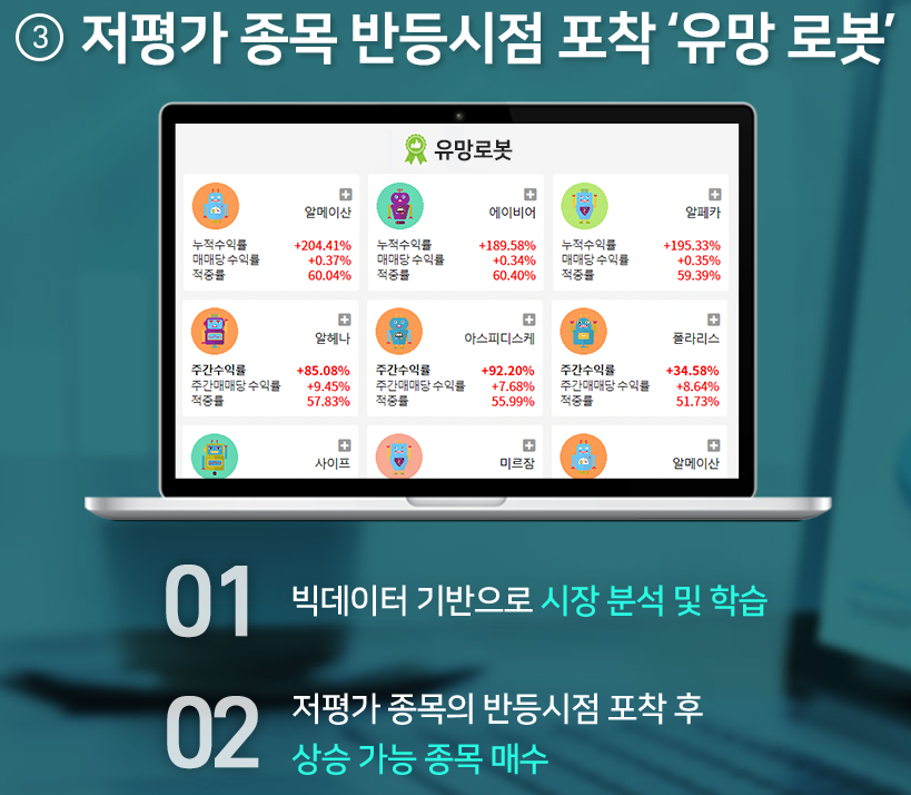 바른이 주식 자동매매 프로그램은 저평가 종목의 반등시점을 찾아주는 유망로봇이 그 기능이구요.