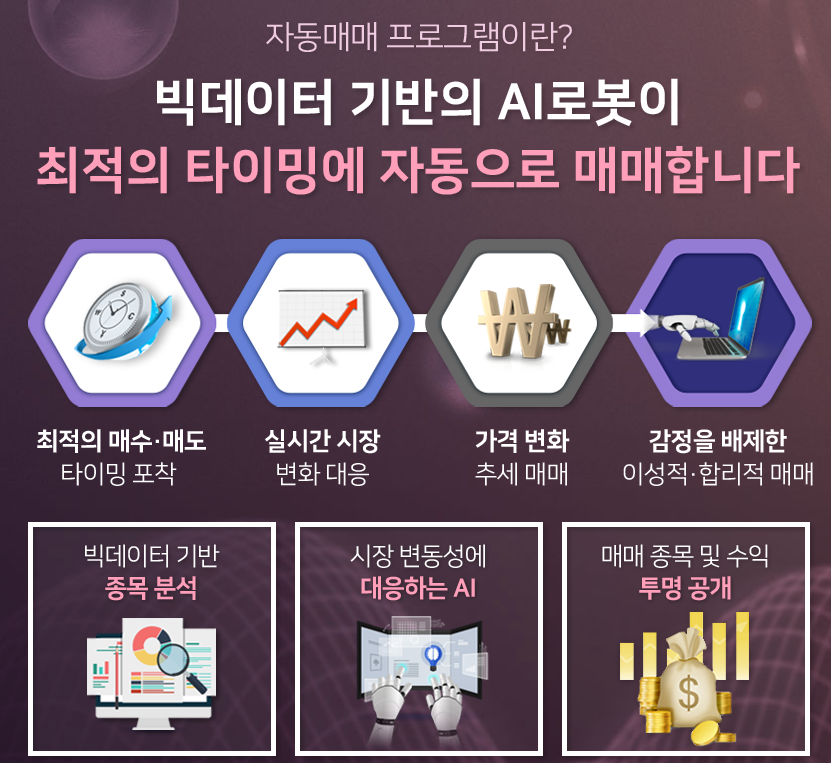 아무래도 요즘 AI가 대세라서 인공지능이 들어간 주식 자동매매 프로그램으로 사용해보기로 했어요. 아무래도 최신 프로그램이라 뭔가 차별점이 있을 것 같더라구요.