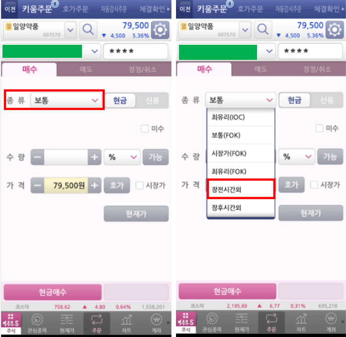 매수나 매도 둘중에 하나를 선택하세요. 그리고 종류탭을 누루고 스크롤해서 끝까지 내리세요. 그러면 종류탭에 아래와 같이 장전시간외가 나타나요. 이 탭으로 들어가셔서 매도나 매수를 하실 수 있어요. 전일종가 고정가격으로만 매수나 매도가 가능해요..