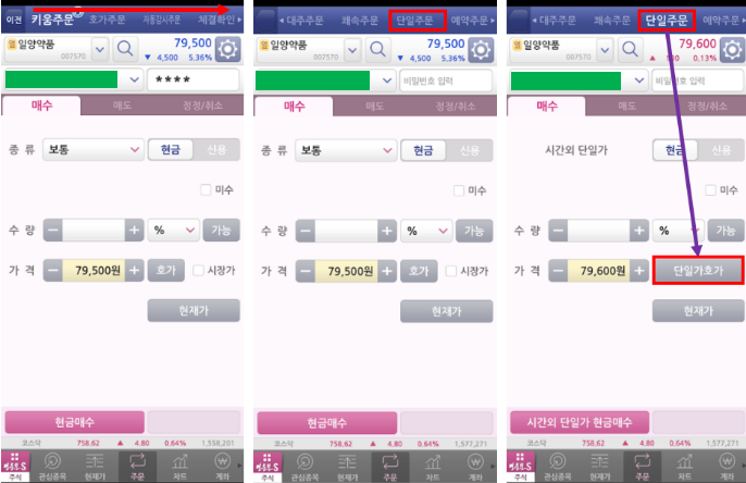 영웅문 모바일에서 장전시간외거래 때와 같이 주문탭을 클릭하면 상단에 키움주문 메뉴가 나오죠. 상단의 메뉴를 오른쪽으로 스크롤해서 가주세요. 그리고 나면 단일주문 메뉴가 나타납니다.