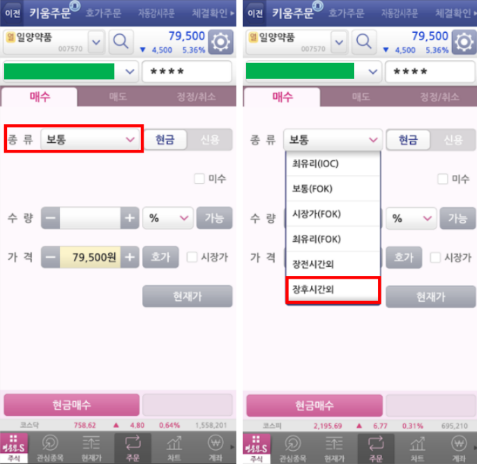 위에서 설명한 장전시간외거래와 동일하게 영웅문 S 모바일을 켜고 하단의 주문 버튼을 누르고 키움 아래와 같이 주문창이 떠요. 매수나 매도 둘중에 하나를 선택하시면 되요.. 그리고 종류탭을 누루고 스크롤해서 끝까지 내리세요. 그리고 종류탭에 아래와 같이 장후시간외가 나타나요. 이 탭으로 들어가셔서 매도나 매수를 하실 수 있어요. 당일종가 고정가격으로만 매수나 매도가 가능해요..