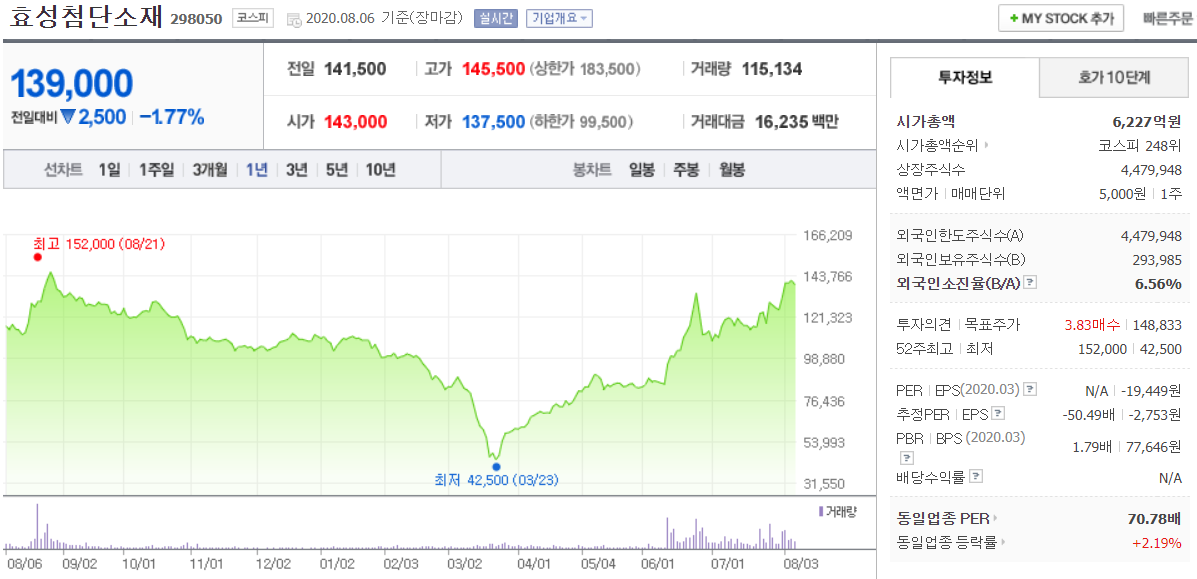 네 번째는 대표적 수소차 관련주로 많이 알려진 효성첨단소재입니다. 효성첨단소재는 수소차 연료탱크의 핵심소재인 탄소섬유를 생산하고 개발하는 업체입니다.