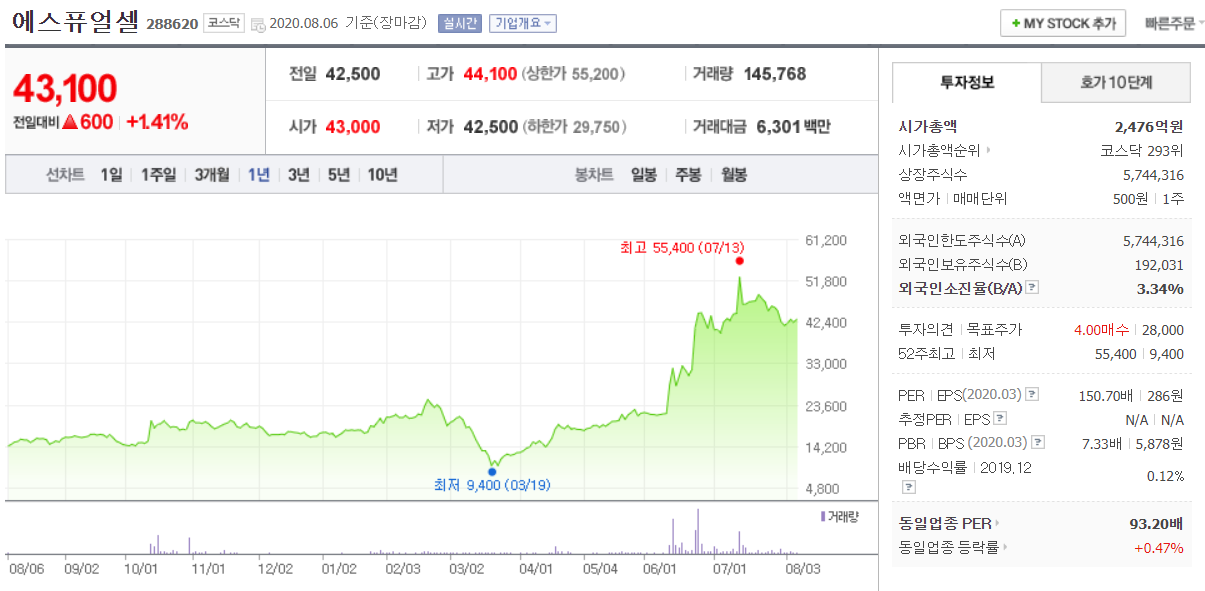 효성첨단소재의 수소차 연료탱크 탄소섬유의 초기 매출비중이 크지 않았지만, 국내 소비량 뿐 아니라 미국과 인도에서의 수주량이 늘어서 올해는 관련분야 흑자가 예상됩니다. 2022년까지 추가로 3000억을 투자하여 액화수소생산시설에 투자를 계획하고 있어요. 그래서 정부의 그린 뉴딜정책과 관련하여 기대받고 있는 기업이지요.5. 에스퓨얼셀