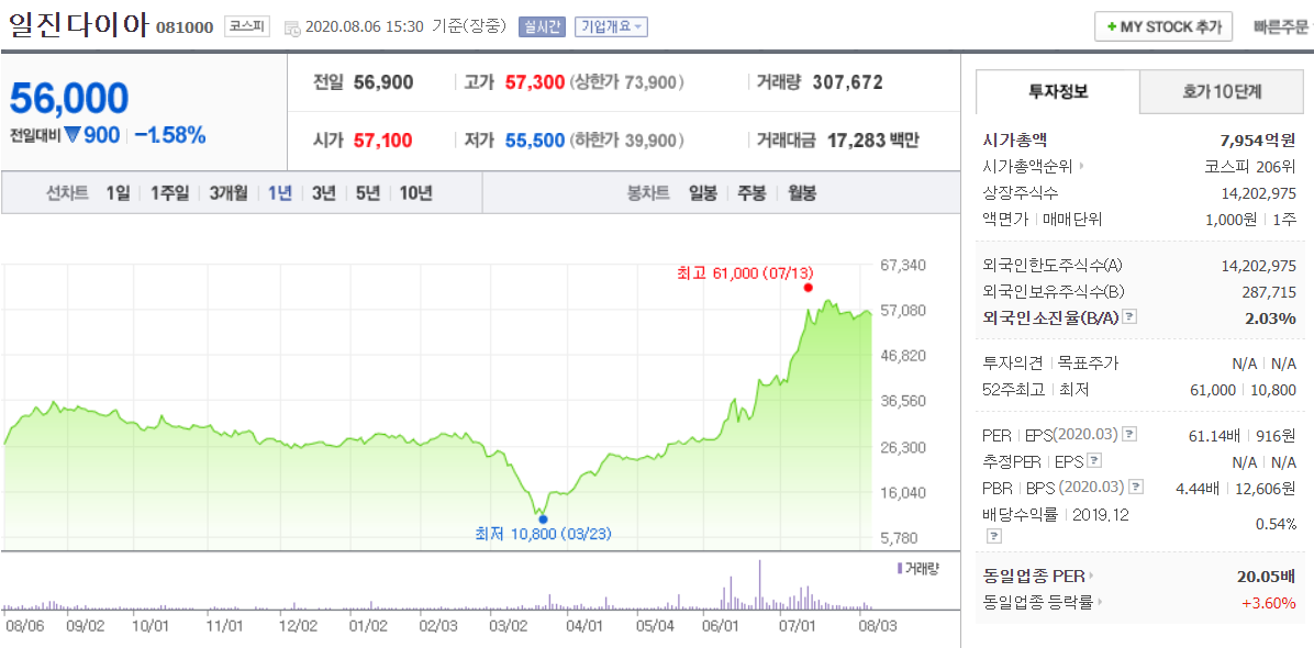 지난 1년간 주가흐름입니다. 상승 추세가 좋고, 작년에 비해서도 3배 이상 주가가 올랐습니다. 주가가 오른 상태에서 추가 상승 여력을 예측하는 분들이 많습니다.2. 일진다이아