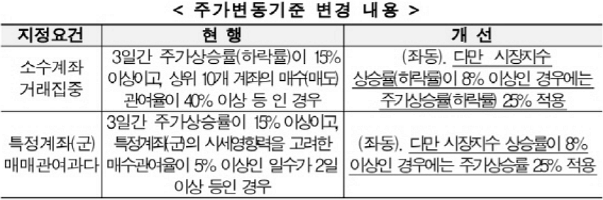 거래소는 시황급변시 투자주의종목 지정요건 중 '소수계좌거래집중', '특정계좌(군) 매매관여과다' 요건의 주가변동기준을 상향한다고 합니다. 시장지수가 3일간 ±8%(매매관여과다는 +8%) 이상 변동시 주가 변동기준을 기존 15%에서 25%로 상향하네요. 다만 시장지수가 3일간 ±8% 미만 변동할 경우 주가변동기준은 현행대로 15% 적용한다고 합니다.주식시장의 시장경보 조치란 일반 투자자들의 뇌동매매를 막고 잠재적 불공정거래 행위자에 대한 경각심을 불러 일으키기위한 조치이며 말그대로 투자자들을 보호하기 위한 표시라고 말씀드렸어요