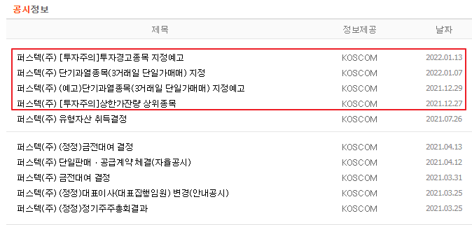 아래는 퍼스텍 투자경고종목 공시 내용입니다. DART를 통해서 확인하실수도 있고 포털사이트를 이용하는 방법도 있어요.
