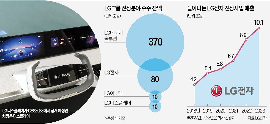 엘지그룹의 전장(자동차 전자장비)과 배터리 사업 수주 잔액이 내년 1분기 국내 최대 규모인 500조원을 돌파할 것으로 전망되고 있습니다. 동력 장치부터 첨단 카메라·통신 모듈까지 아우르는 다양한 제품 포트폴리오를 앞세워 고객사를 늘린 덕분이라는 분석입니다.