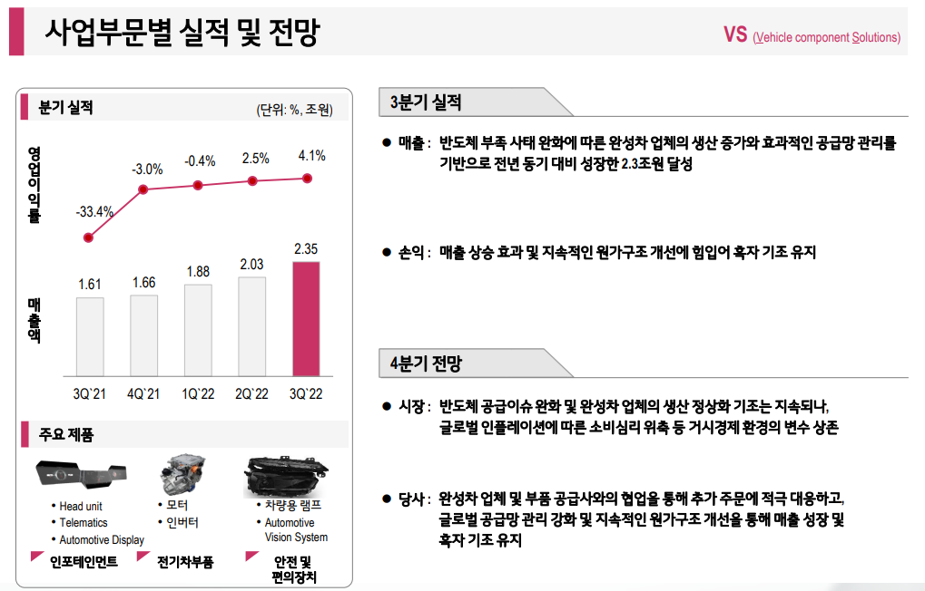 LG에너지솔루션의 전기차 배터리와 LG디스플레이의 자동차용 디스플레이 패널도 각각 글로벌 완성차 업체들에서 주력 파트너가 되고 있습니다. 자동차용 모터, 센서, 카메라 모듈 등을 생산하는 LG이노텍도 올해 3분기부터 전장 사업에서 흑자전환에 성공했습니다.